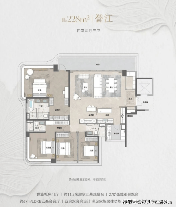 户型设计上,项目主打LDKB洄游方厅格局,客餐厨一体化布局,动线流畅高效。建面约228㎡的“誉江”户型,主卧开间达约6.8米,套内面积超28㎡,配备独立衣帽间与卫浴,私密性与尊崇感兼备;建面约219㎡户型更拥有约16米L型观景阳台,270°环幕视野一览无余,堪称江景大平层中的典范之作。