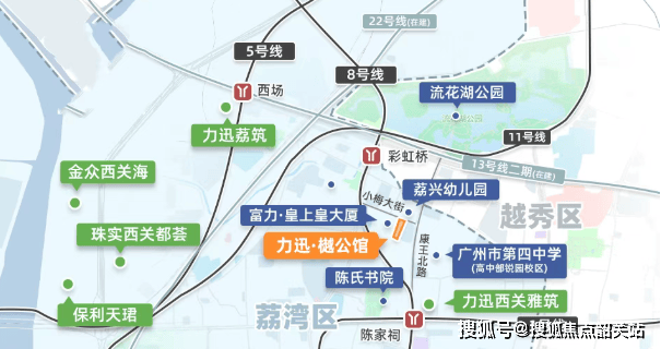 力迅樾公馆位于老荔湾腹地,距离越秀区仅一公里,步行约6分钟即可抵达陈家祠站(1/8号线)或彩虹桥站(8/11/13/22号线)。其中,彩虹桥站作为广州地铁的重要枢纽,汇聚四线交汇,未来还将接入13号线二期,直达珠江新城,实现“一次换乘通达全城”的高效出行体验。