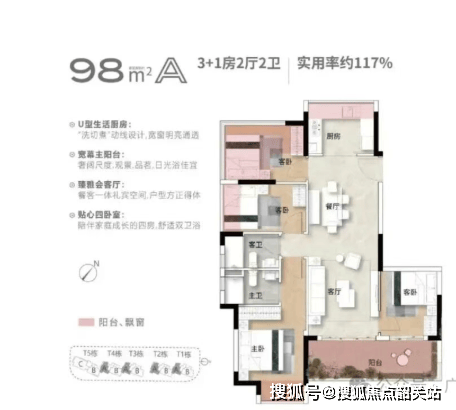 约98㎡户型:巧妙布局为3+1房2厅2卫,主卧带大飘窗,客卧直连主阳台,空间通透灵动,满足多孩家庭或三代同堂的进阶需求。