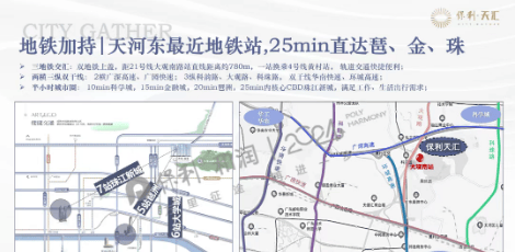 保利天汇距离21号线大观南路站约1.2公里,步行大约需要15分钟。对于依赖地铁出行的居民来说,建议选择电动自行车作为接驳工具。此外,周边还有广深高速、广园快线等主要道路,自驾出行十分便捷,前往珠江新城、琶洲等地均能在40分钟内到达。