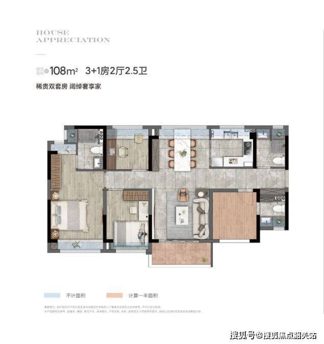 D 户型:4 房 2 厅 2.5 卫,建面约 108㎡