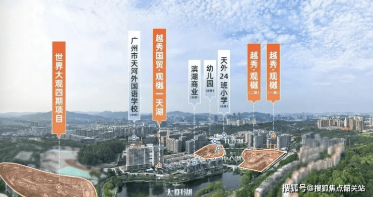 - **规划实锤**:越秀观樾占地面积206400平米,建筑面积133000平米,总栋数25栋,总户数760户,容积率1.91,绿化率35%,总车位数1637,车位配比1:2.15 。项目自配15班幼儿园和24班小学,引进广州天河外国语教育集团合作办学。沿湖打造约1万平商业体,内部设有约2000方湖岸会所。