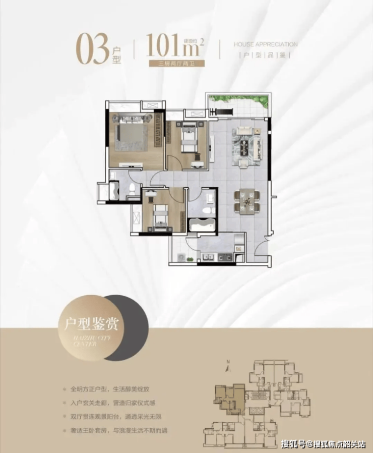 接下来是一百零一平方米的三房两厅两卫户型,更适合计划添丁的家庭。双卫的设计巧妙地解决了早晚高峰洗漱拥挤的问题,提升了生活的效率。客厅、餐厅、厨房采用了一体化布局,使得空间更加通透开阔,家人之间的互动也更加便捷。无论是在厨房忙碌的妈妈,还是在客厅玩耍的孩子,都能随时交流眼神,分享快乐。六点二米的南向阳台是这个户型的点睛之笔,它兼顾了生活与休闲的双重功能。既可以晾晒衣物,也可以摆放花草茶座,成为一个小型的家庭花园。次卧的空间充裕,完全可以满足二胎家庭的需求,让两个孩子都有独立的成长空间。这个户型在保证功能性的同时,也兼顾了舒适性,是改善型家庭的不错选择。