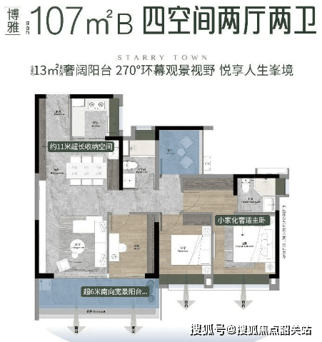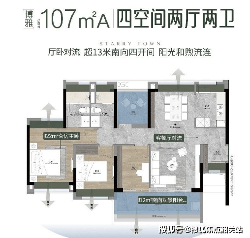 107㎡A户型四房两厅两卫:配置南向观景玄关,客厅主卧双南北对流。