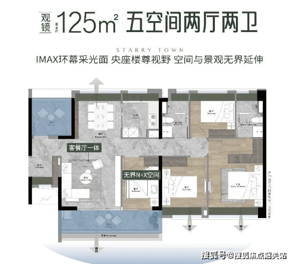 125㎡五房两厅两卫:客餐厅南北对流,餐客一体化,百变大方厅。