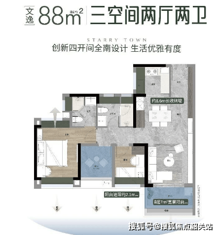 88㎡三房两厅两卫:四面宽小户型,朝南居家生活,超11米景观线。