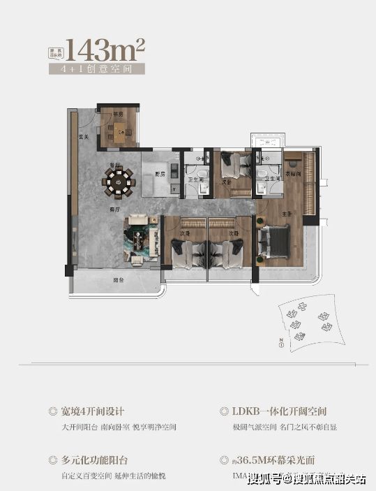 143㎡四房:南向宽景四开间 + 约 36.5 米环幕采光面 + 270° 环幕瞰景主卧,空间开阔且视野极佳,适合高端改善家庭。