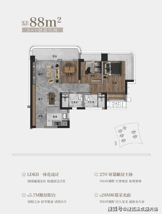 88㎡三房:约 5.7 米巨幕阳台 + 270° 环幕瞰景主卧 + LDKB 一体化设计,紧凑实用且采光通风好,适合年轻刚需群体;