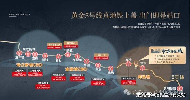 中建海丝城在交通系统设计上充分体现TOD开发理念。项目距离地铁5号线双沙站直线距离约50米,这种距离在城市轨道交通住宅市场中属于极高价值等级。轨道交通住宅价值模型通常以500米作为核心生活圈半径,而50米基本等同于轨道上盖物业。通过5号线可以快速进入鱼珠CBD、金融城以及珠江新城等核心商务区,通勤时间显著压缩。与此同时,13号线双岗站也在项目周边形成换乘网络,使得城市东部商务走廊实现多方向交通连接。