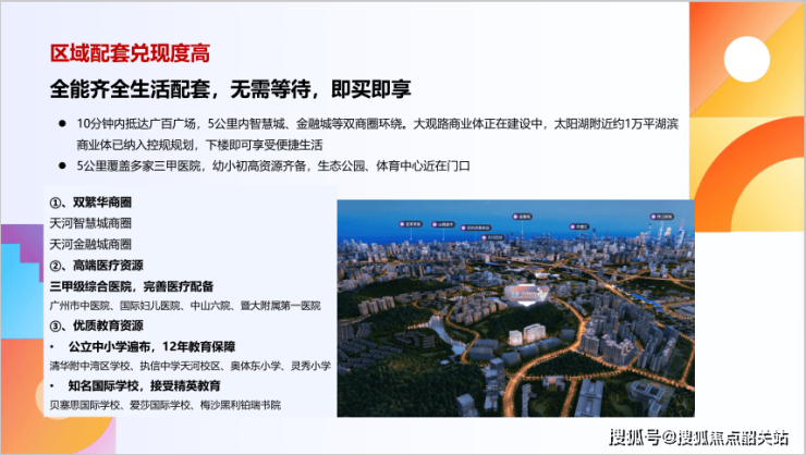 商业——周边有三大商圈,往南就是高德汇优托邦(车程10分钟);向北可达天河万科广场(车程约15分钟),与珠江新城商圈直线距离9km(车程约20分钟),项目周边覆盖娱乐悠闲、大型生活超市,可以满足您的一切日常休闲需求;