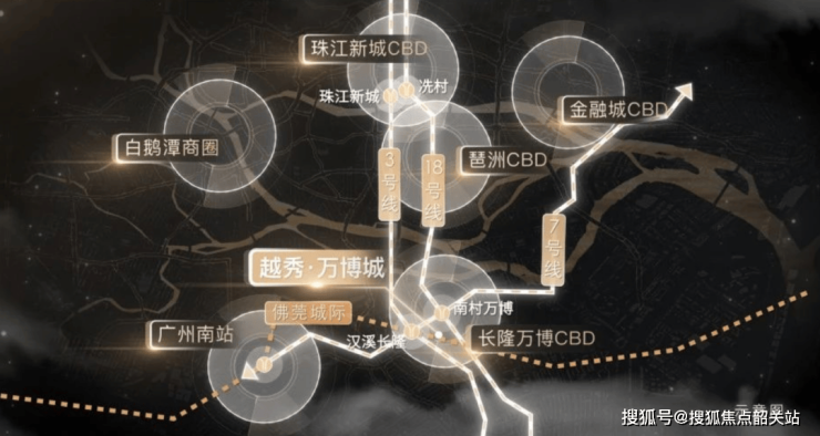 项目到南村万博E2口约1公里,可以乘坐7号线18号线,7号线往西通到南站和佛山的顺德美的大道。往东北方向连接我们的大学城,然后上去科学城的燕山站,把东部连起来啊。18号线从南沙天河,南北贯通,3站琶洲,4站冼村。后期往南通中山,往北到花都。