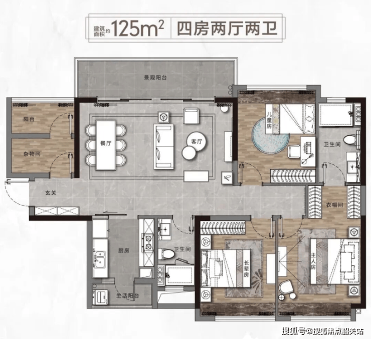 目前主力在售的是105㎡三房和125㎡的3+1房,均为现房实景呈现。以105㎡户型为例,南北通透布局,客厅与主卧朝南,厨房和两个卫生间都有自然采光,没有暗房死角。动线紧凑但不局促,三口之家入住绰绰有余。而125㎡的“3+1”户型则多出一个灵活空间,可改书房、儿童房或储物间,适合二胎家庭或需要居家办公的人群。