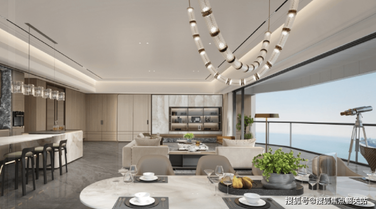 客厅采用270°环幕采光设计,连接超10米长阳台,江景、园景尽收眼底,夜晚城市灯火亮起,景色更加迷人,无论是休闲放松还是商务洽谈,都能拥有绝佳的视野体验。
