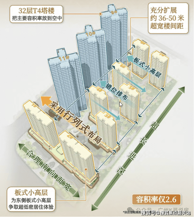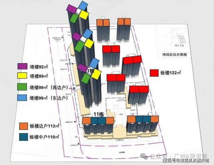 全盘一共规划有11栋住宅,其中塔楼3栋,板楼8栋,涵盖2T2板楼与2T4塔楼两种产品。
