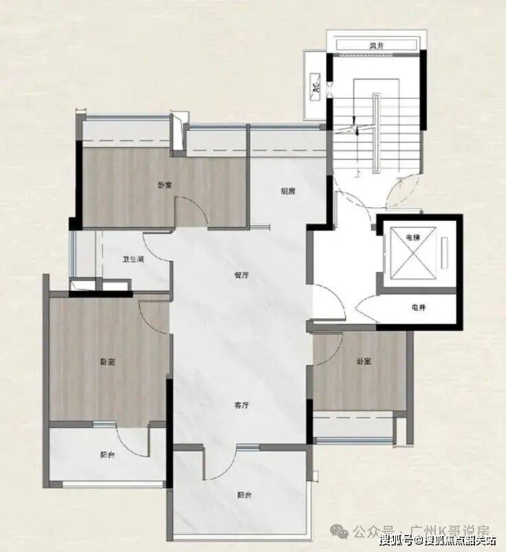 类四叶草户型,客餐厨居中,四个卧室分布在三个角落,家庭成员彼此不干扰;