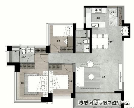 主卧配有270°无遮挡飘窗,开放式餐厨设计满足从两代人到三代人的就餐需求。