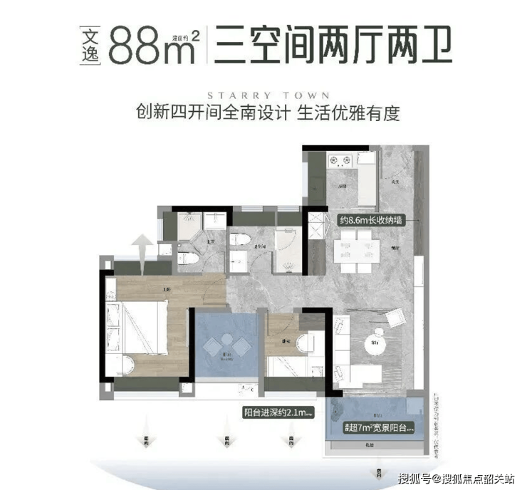 建面约88㎡三房两厅两卫,作为刚需首选户型,亮点突出:罕见四面宽设计,全屋朝南,三卧室均为南向布局,超11米景观线,让室内时刻保持充足采光与良好通风;精细化收纳设计,配备约10米收纳墙,充分满足全家储物需求,藏纳生活琐碎与兴趣爱好;户型方正规整、动静分区合理,无空间浪费,适配新婚夫妻、三口之家等刚需家庭。
