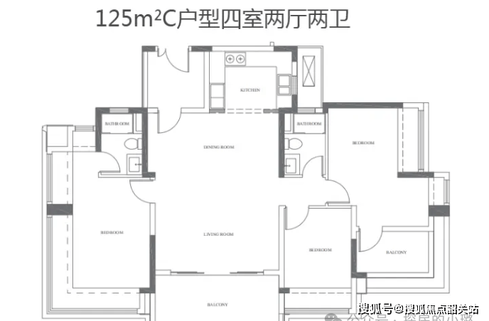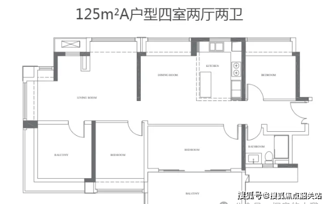 125㎡四房:四开间朝南,客厅面宽达5.2米,采用270°飘窗设计,动静分区明确,适合三代同堂家庭。