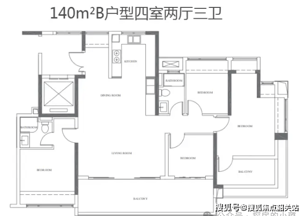 140㎡四房:独栋板楼设计,配备8.4米南向巨幕阳台,双主套配置,实用率高达约110%。