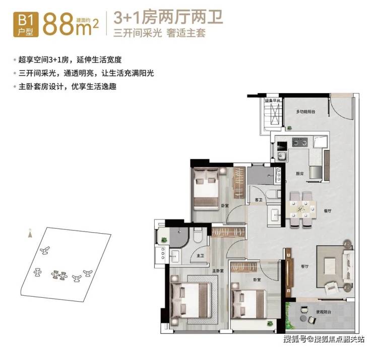 【88㎡3+1房2厅2卫】经典竖厅格局,三开间采光,近11㎡主卧套房设计,优享生活逸趣,稀缺小户型,低总价晋阶天河