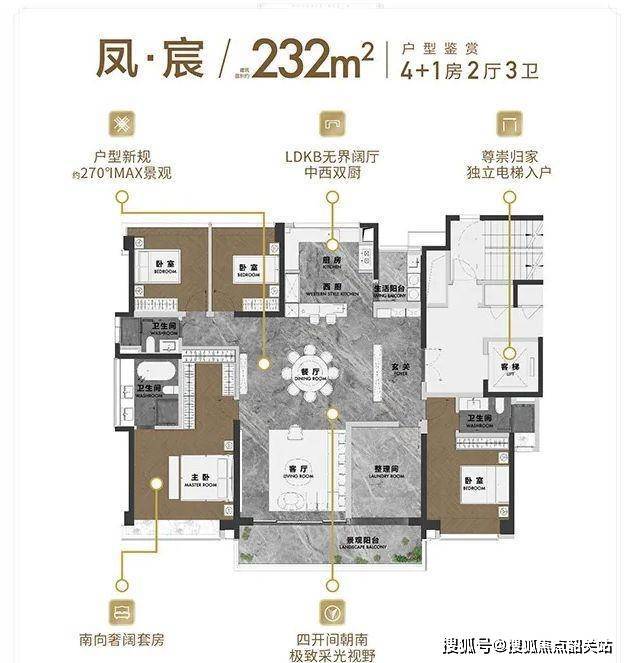 此户型在空间尺度上进一步升级,展现出更加阔绰的居住空间。客厅空间更为宽敞,挑高设计增强了空间的通透感与大气度,搭配大尺寸窗户或落地窗,引入更多自然光线与窗外景观。餐厅可容纳更大尺寸的餐桌,满足大家庭聚餐的需求。主卧套房不仅面积更大,还可能配备舒适的休息区,让主人在繁忙的生活中拥有一片宁静的私人空间。次卧同样宽敞舒适,可满足家庭成员不同的居住需求。户型的动静分区更加合理,休息区与活动区互不干扰,让居住者在享受家庭欢乐时光的同时,也能保证良好的休息环境。此外,约 270° 的景观视野,让居住者仿佛置身于美景之中,享受高品质的生活。