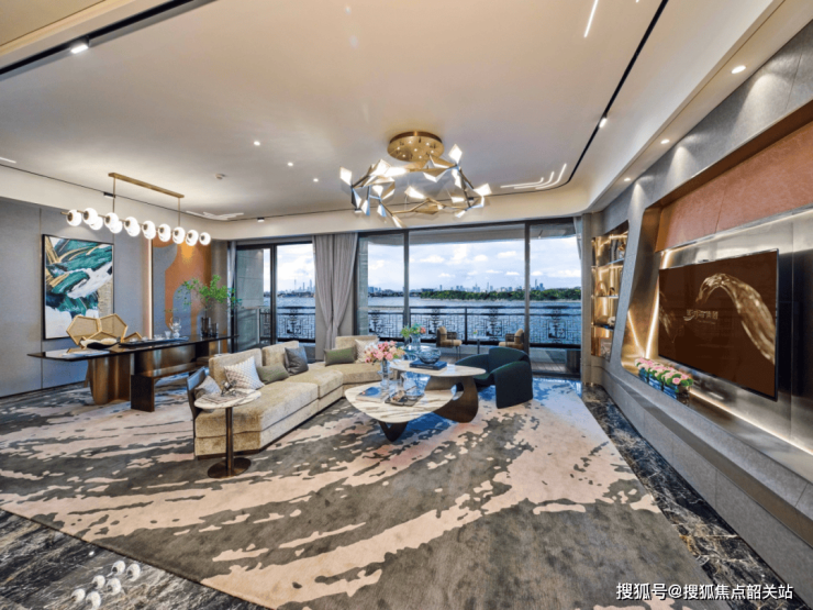项目建筑采用晋徽结合风格,传承十字中轴式厅房排布,纵轴布局超豪华客厅、私人宴会厅、社交厨房等功能区,横轴贯通南北,实现空间通透与景观最大化。3.47-3.57 米奢阔层高,搭配 270° 一线江景视野,四开间朝江、三开间朝园,景观资源极致利用。