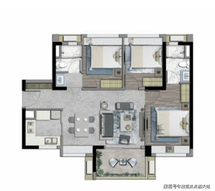 约92平方米3房2厅2卫:创新横厅产品,空间感十足。南北对流,270°阳台设计,搭配双卫,极大地提升了居住舒适度。