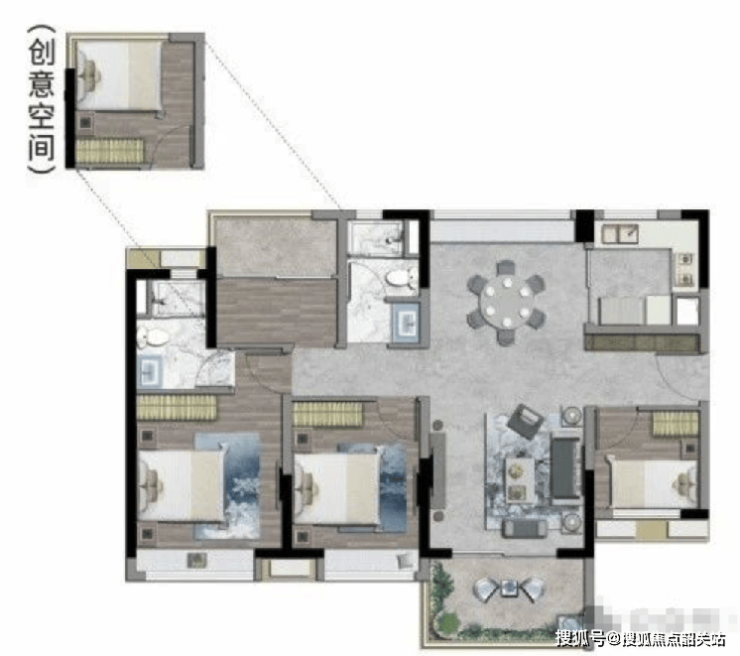约113平方米3 + 1房2厅2卫:南北对流的单边位户型,双向采光,户型方正,为业主营造舒适的居住空间。