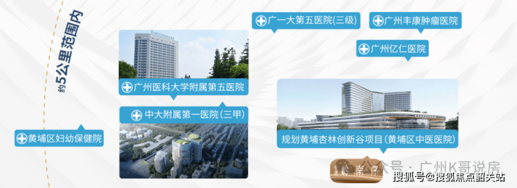 附近几所三甲医院中大附属第一医院(三甲),广医大附属第五医院(三甲)、黄埔区中医医院、广州市黄埔区妇幼保健院等,都在2公里之内。