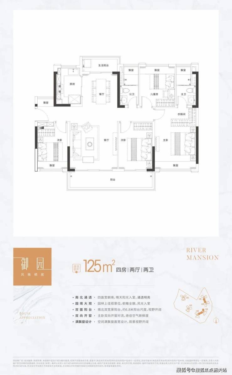 125㎡御园4房户型:四开间朝南,采光充足,客厅与餐厅连通,空间感十足。