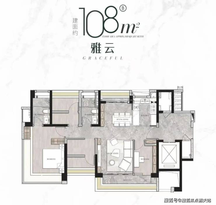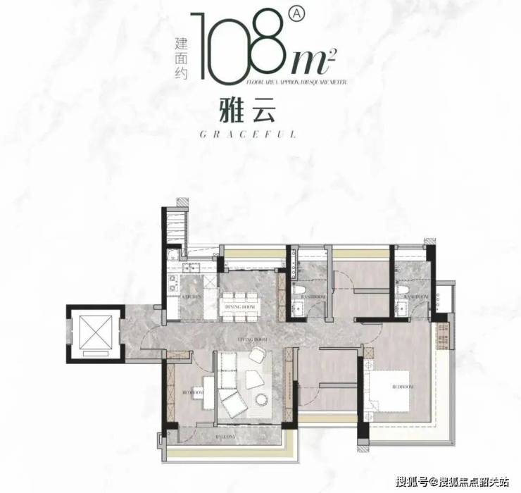 建面109㎡户型,四房两卫设计,南北对流双阳台,两个次卧都是阳改房,赠送一半面积,总价350-380万左右。