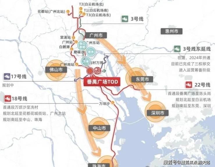 乘坐3号线可直达体育西,也可到番禺广场换乘18号线,可实现3号线、18号线、22号线等多轨串联,在番禺广场乘坐18号线,1站到万博CBD,快线2站到琶洲,3站到珠江新城,自驾的话,周边有亚运大道、番禺大道和南沙港快速,去往万博、琶洲、南沙等地也很方便。
