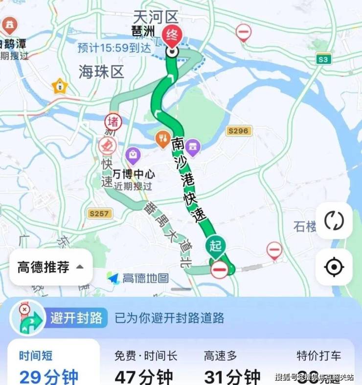 自驾去琶洲:亚运大道转南沙港快速,再接科韵南路,全程26公里,耗时30分钟左右,高速费11元,走国道需要上新光快速,需要50分钟左右。
