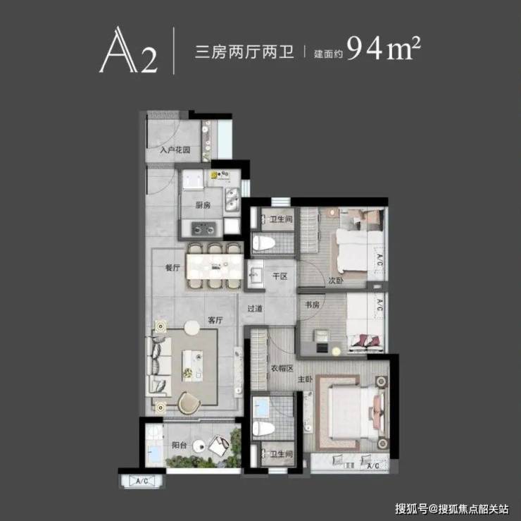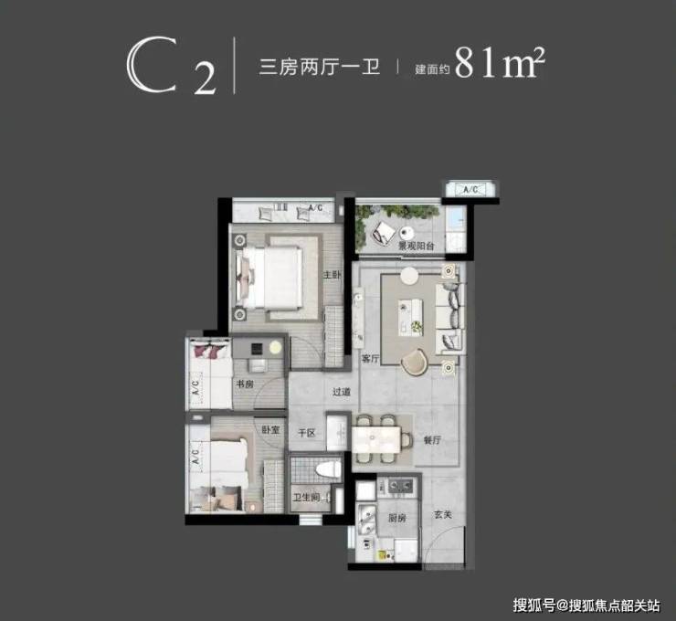 目前在售的主要是13-14号楼,提供79㎡和81㎡精装三房户型。该户型设计具有高实用率,入户花园赠送面积大,整体使用率高达87%。客餐厅阳台一体化设计,采光通风良好,飘窗设计进一步提升了居住舒适度。此外,户型动静分区合理,干湿分离,居住体验更加优越。