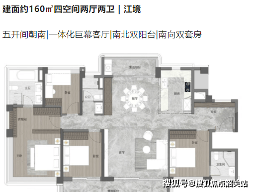 135㎡四房两卫:270° 全景主卧套房 + 一体化瞰江宽厅,三开间朝南,二孩家庭首选;