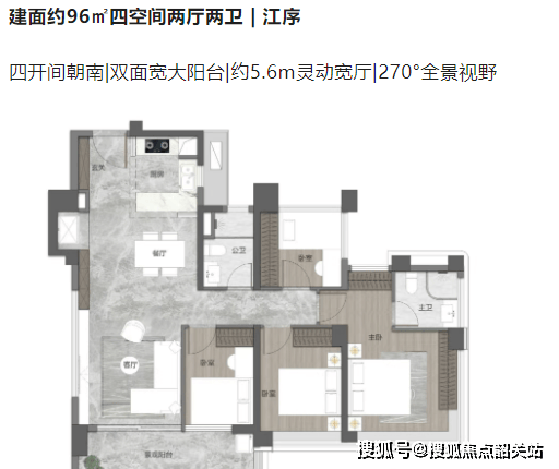 95㎡四房两厅:市场罕见小户型,使用率超 120%,5.6 米灵动宽厅 + 双面宽阳台,满足年轻家庭进阶需求;