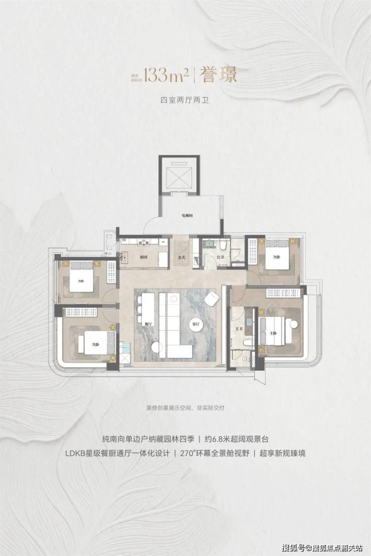 133㎡四房两厅两卫:纯南向单边户,6.8米宽景阳台+LDKB一体化布局,厨房、餐厅、客厅、阳台连成一片洄游动线,空间通透开阔;主卧为270°转角飘窗套房设计,配备独立衣帽间与卫浴,私密性强;