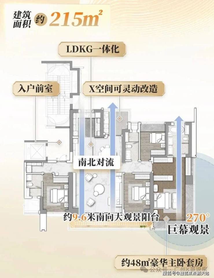 此外,该户型的空间格局具有高度灵活性,可从三房调整为五房,从容应对从独居到多代共居的生活阶段变化。约80厘米飘窗砸去约50厘米的设计,进一步增加了地面使用空间,提升了实用性。对于预算充足的购房者,项目还提供了建筑面积约170平方米和215平方米的大平层户型。170平方米户型采用南北通透对流设计,四开间朝南,主卧套房面积约28平方米,拥有无界视野沉浸式观景体验;215平方米户型则为3梯3户设计,带超大入户前室,南向大景观阳台长达9.6米,主卧配备270度观景飘窗,可俯瞰园林景观。