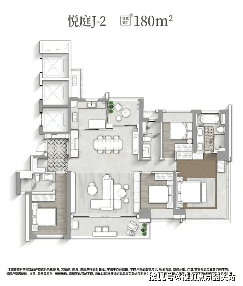 二期6栋推出的全新180平方米户型,是该项目的明星产品之一。该户型货量稀缺,整盘合计供应仅84套,占比2.6%,极具收藏价值。其LDK一体化超聚厅开间达6米,若将客厅与多功能房打通,横向尺度更可延展至惊人的约9米。公共空间面积超过80平方米,包括客厅、书房、南北双阳台与餐厨区域,为家庭聚会、休闲娱乐提供了充足的空间。三个卧室均可直望中心园林,配备大面宽飘窗,几乎将窗外绿意搬进屋内,极大提升了居住舒适度。