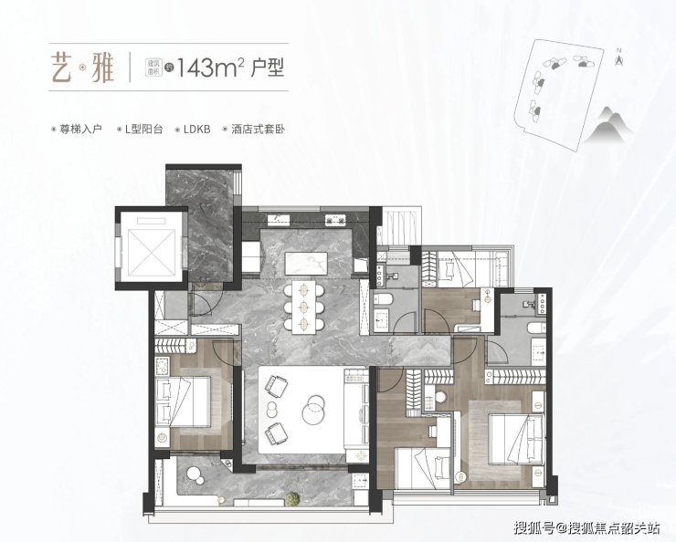 2. 143㎡四房三卫户型:该户型定位为高端改善型户型,在空间尺度与居住舒适度上全面升级,彰显圈层尊崇感。四房三卫设计,配备双主卧套间,满足多代同堂或高端改善家庭的居住需求,保障每位家庭成员的私密性与舒适度。整体空间开阔通透,大面宽、短进深设计,最大限度引入自然光线与景观视野,户户瞰山,让每一个房间都能享受白云山景与社区园林景观。客厅与餐厅相连,形成开阔的社交空间,搭配全景落地窗,营造出大气磅礴的空间氛围,适合亲友宴请与家庭欢聚;主卧套间配备独立卫浴、衣帽间与景观飘窗,空间宽敞舒适,彰显主人尊崇身份;次卧套间同样配备独立卫浴,满足老人或子女的居住需求,提升居住舒适度。此外,该户型配备独立玄关、储物空间,兼顾实用性与仪式感,细节之处尽显匠心。