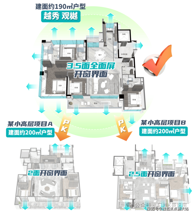 户型三开间朝南,为了获取更大面宽视野,项目还将全屋的窗地比做到38%。
