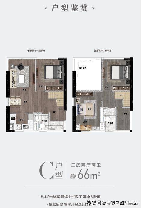 虽面积精巧,但布局合理,充分利用每一寸空间。4.5 米层高打造出立体生活场域,通过合理的空间分隔,实现两房两厅一卫的功能。一层设置客厅、餐厅与开放式厨房,一体化设计让空间开阔通透,满足日常起居与用餐需求。客厅连接窗户,保证充足采光与通风。二层巧妙布局两个卧室,私密安静,为居住者提供舒适的休息空间。这种户型特别适合单身人士或年轻情侣,既能满足居住需求,又能享受灵动多变的空间体验,同时其低总价特点,也降低了购房门槛,是投资与自住的不错选择。