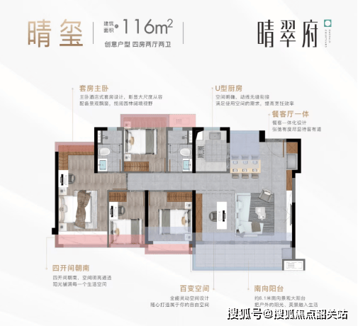 116-130㎡四房:主卧配备270°转角飘窗,视野开阔,五开间朝南设计,尺度感媲美高端改善产品。