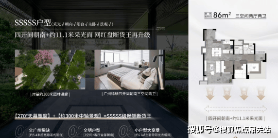 建面约86㎡三房:被誉为“综合评分最高”的明星户型,四开间朝南,总面宽约11.1米,主卧配备270°无立柱景观飘窗,视野开阔无遮挡,总价仅230–250万,是广州南向三房中极具竞争力的选择。