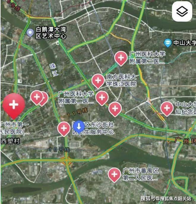 项目交通条件极为便利。距离在建的地铁 10 号线东沙站约 700 米,预计 2025 年底开通,届时 1 站可达对岸海珠西,4 站至中大,6 站抵滨江东,更可零换乘直达珠江新城,快速融入城市核心区域。1.3 公里处已开通的地铁 11 号线环线,进一步拓展出行范围。1 公里内分布着健康港总站、沙洛市场等公交站,提供多样化公共交通选择。同时,规划中的水上巴士及港湾码头(计划 3 年内完工)将增添独特出行方式。自驾方面,邻近白鹅潭大道,外通东沙石岗隧道,快速接驳环城高速、东新高速,畅行全城。