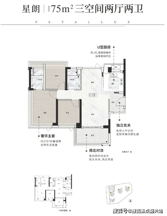 75㎡三房两卫:小面积大空间,主卧配备270度环绕飘窗,采光通风极佳,适合三口之家或年轻夫妻。