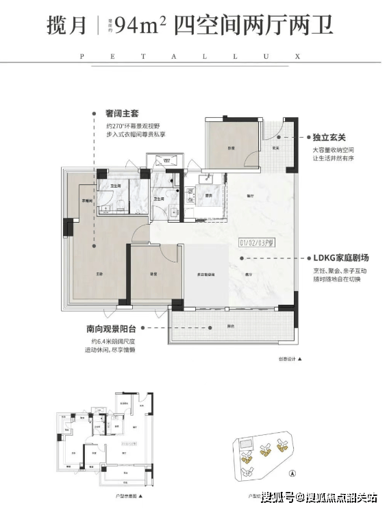 94㎡四房两卫:LDKG一体化设计,约6.4米超宽阳台连通客厅,空间布局合理,满足二孩家庭需求。
