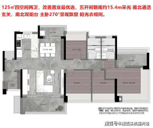 二期加推楼栋为 33 层,2 梯 5 户,建面约 76/85/86/125㎡全南朝向 3/4 房。建面约 75㎡三空间两卫户型,四开间朝南,有全明转角玄关、开放式厨房、开阔景观阳台以及南北对流主套和衣帽间,是年轻人主城上车首选。86㎡三空间两卫户型,南向 4 开间约 11.1m 采光,双进私密玄关搭配 5.4m 跑道式阳台,主卧 270° 无立柱景观飘窗与阳光衣帽间,适合三口之家一步到位。103㎡四空间两卫户型,五开间约 14m 采光,开放式厨房,270℃无立柱转角阳台,带阳光梳妆台与衣帽间,满足三代同堂换房需求。125㎡四空间两卫户型,五开间朝南约 15.4m 采光,南北通透玄关,南北双阳台,主卧 270° 景观飘窗与阳光衣帽间,是改善置业的优选。二期户型全南向设计,得房率达 100%,空间利用高效。