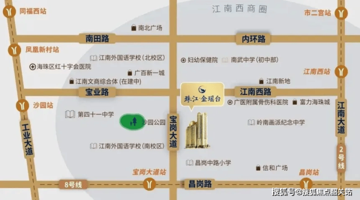 要读懂珠江金瑶台的价值,首先要读懂它所在的海珠江南西板块。作为广州传统的核心居住区之一,江南西早已不是单一的“老城区”,而是形成了“烟火气+商业圈+便捷交通”的成熟生活闭环,这也是它常年吸引购房者青睐的核心原因。