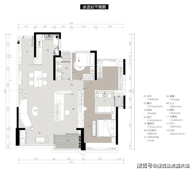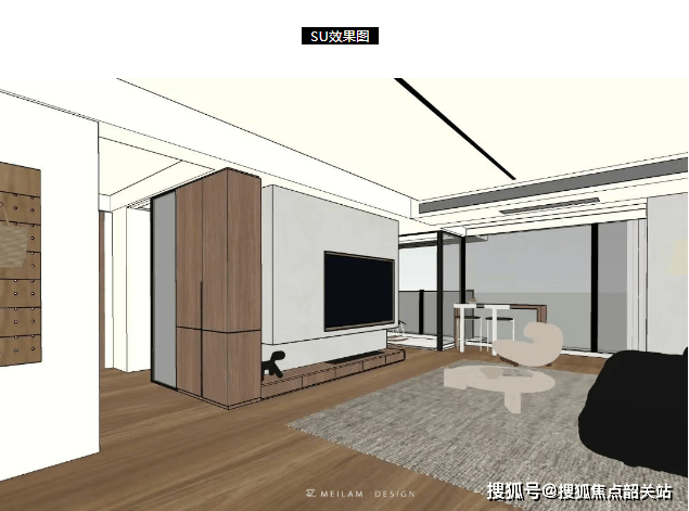 139㎡户型的改造以中古风为设计主线,致力于打造一个复古韵味与现代功能完美融合的空间。在平面布局调整上,通过拆除客厅相邻次卧隔墙,创造出开放式书房,同时利用双面电视背景墙巧妙分隔空间,客厅面用于放置电视,书房面则配置书桌,既实现了空间功能的多样化,又增加了空间的互动性。全屋客餐厅通铺木地板,增强了空间连贯性,而阳台半封闭设计(50%封闭作休闲区 + 50%保留开放式通风),既满足了休闲需求,又保证了通风效果。主卧改造同样独具匠心,保留原卫生间功能,合并相邻房间打造步入式衣帽间,取消传统电视改为投影系统,提升了居住的舒适性与趣味性。在整体色彩搭配上,温暖的柚木色、沉稳的黑色和素雅的暖白色构成主色调,奶油色涂料墙面与橡木直拼地板搭配,营造出内敛而富有质感的氛围。客厅区域,微水泥涂料与悬浮式柚木电视柜的电视墙设计,搭配仿旧处理的水磨石砖阳台地面,在三联动玻璃门处自然过渡,形成独特的质感对比。黑色真皮沙发以其硬朗线条和自然使用痕迹,诠释中古风家具的历久弥新,黑色轨道灯则增添了现代工业气息。书房面的柚木书架与可滑动轨道插座,既保留复古元素又兼顾现代便利。卧室以浅灰、米白与木色为主,简约床具搭配浅灰床品与棕色抱枕,尽显质感,隐藏式电动幕布和玻璃柜门衣帽间的设计,更是为空间增添了复古优雅之感。